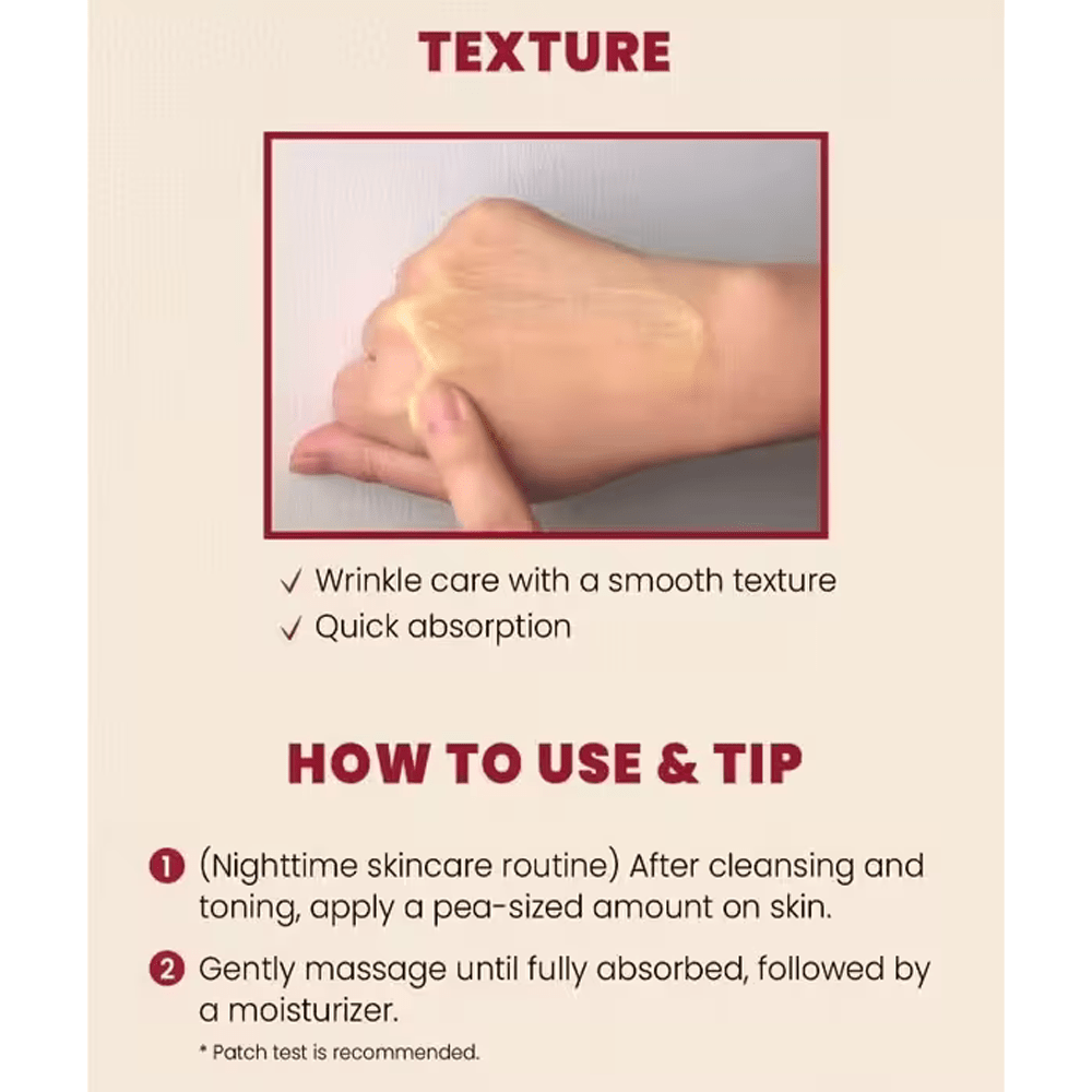 A potent anti-aging serum powered by 2% Retinal Liposome, an advanced form of Vitamin A that promotes skin renewal, reduces fine lines, and improves firmness. Infused with Black Ginseng Extract, known for its strong antioxidant and revitalizing properties, it energizes dull skin and enhances elasticity for a smoother, youthful complexion. The lightweight texture absorbs quickly without irritation, making it ideal for nighttime use.